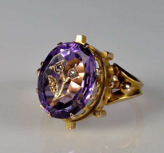 Antique 14K Gold Rose Of Sharon Diamond Ring Amethyst Inlay C.1860